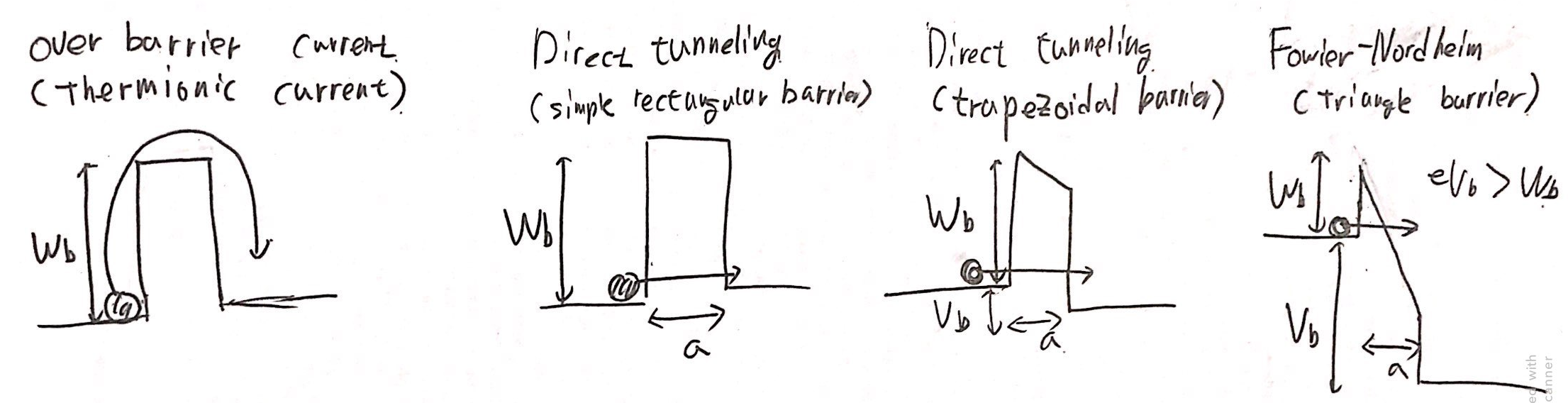 왼쪽에서 세번째 그림처럼 Vb와 같은 전압(0<eVb<Wb)을 가해준다면, Barrier에 영향은 더 심각해집니다.