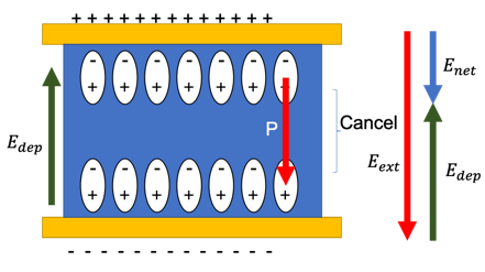 $$P=\chi E$$라 합니다. 이떄 $$\chi ~:~Electric susceptibility $$는 Electric field에 대해 얼마나 dipole이 정렬이 되는지를 나타내는 항으로 이들이 정렬될때 내부 원자들 끼리는 Cancel이 되어 양 극에만 이 원자들의 전하가 남는데 이 전하때문에 생기는 전기장을 depolarization field라고 합니다. 즉 실제로 인가되는 전기장은$$\vec {E_{net}}=\vec{E_{ext}}-\vec{E_{dep}}$$인 net polarization입니다.