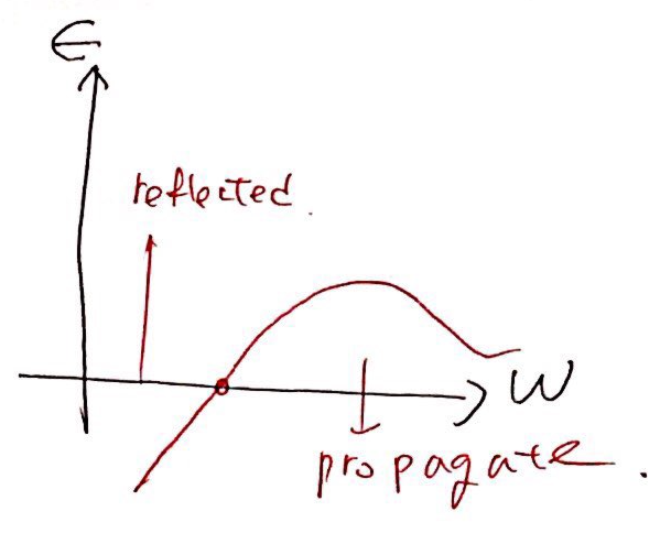 따라서 실수부만 고려한다면 다음과 같은 그래프를 얻을 수 있는데, 이 그래프는 절연체로 𝞽의 효과는 무시한 것입니다. 즉 주파수에 따라 reflected 되는 것과 propagate되는 경향이 달라지는데, 𝟄>0이면 전자기파 진행하고, 𝟄<0이면 전자기파가 반사 됩니다.