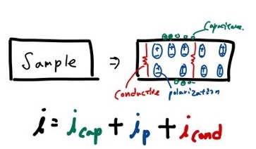 로 나타낼 수 있습니다. 여기서 C는 sample의 Capacitance이고, V는 가한 Voltage, A는 Sample의 면적, P는 Polarization, R은 저항입니다.