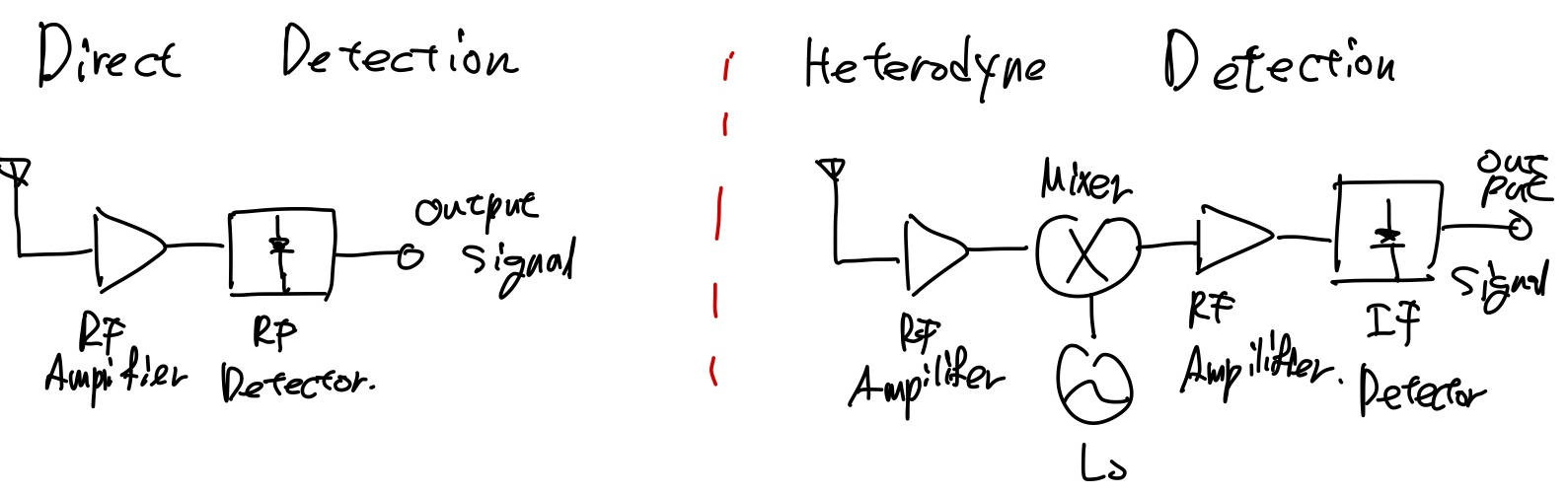 검출기는 크게 2가지로 나눌수 있는데, 바로 검출하는 Direct Detection과 downconversion으로 주파수를 내려 측정하는 Heterodyne Detection이 있습니다.