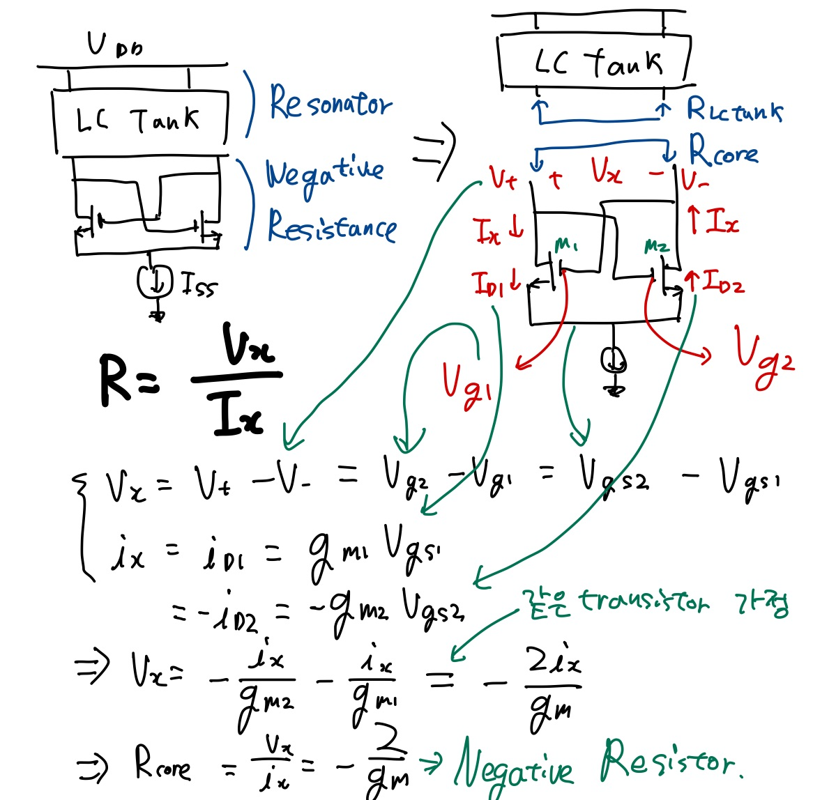 그럼 바로 LC Cross coupled oscillator를 보겠습니다. 아래 그림과 같은 회로의 Core 부분의 전압 전류를 계산해 본다면