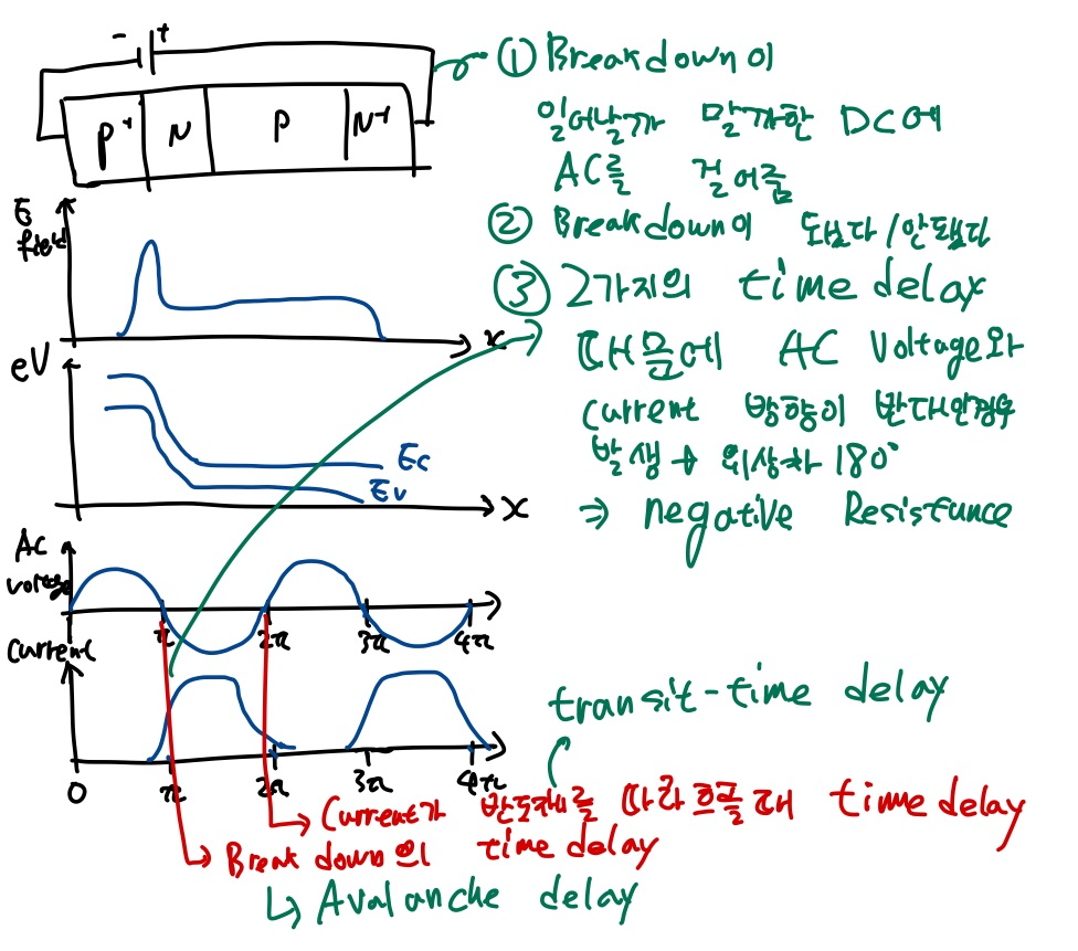 여기서 사용하는 것은 Avalanche breakdown입니다. IMPATT라 불리는 이유는 Avalanche에서 impatt ionization이 발생하기 때문입니다.