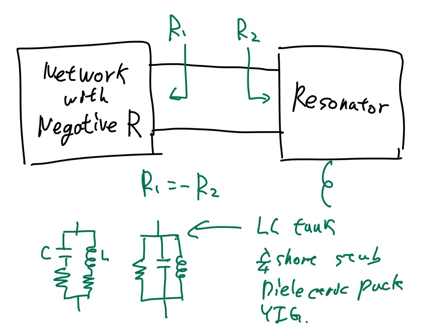 $$R_1=-R_2$$를 만족해야합니다. 이를 만족하게 된다면, 소신호 였던 아주 작은 Negative resistance가 공명기로 들어가 특정 주파수를 증폭시키게 되고 Network는 이를 받아 음저항으로 공명기에 다시 돌려주게 됩니다. 그렇다면 공명기능 특정 주파수를 더 증폭하게 되고 이와 같은 방식이 반복 됩니다. 즉 Two port view로 확인 한다면