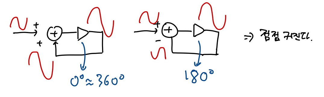 다음으로 Transistor를 이용한 방법에대해 다룰건데요. 여기서는 앞서 보았던 Barkhausen's Criteria가 중요합니다. 짧게 복습을 하자면 다음그림만 보시면 됩니다.