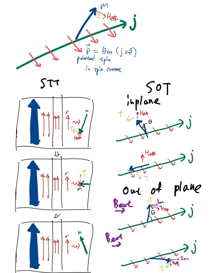 다시말해 자화반전시키는 방법은 Torque를 이용하는 것인데 이미 [핵심] spin torque : field like torque VS damping like torque포스팅에서 다루었습니다. 정리하자면 Torque는 지금까지 밝혀진바는 총 4가지
