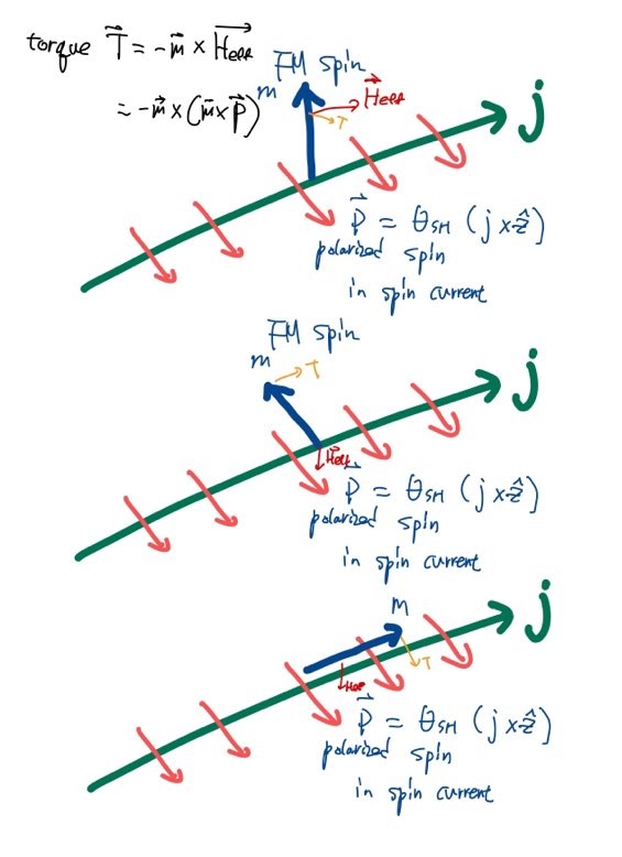 즉 $$-|\gamma |\frac{\hbar}{2e}\frac{\theta _{SH}}{M_s d}\hat {m_2}\times [\hat {m_2}\times (\hat z \times \hat {J_N})]$$ 입니다. 즉 이는 SOT에 의해 만들어지는 스핀전류값이 매우 중요합니다.