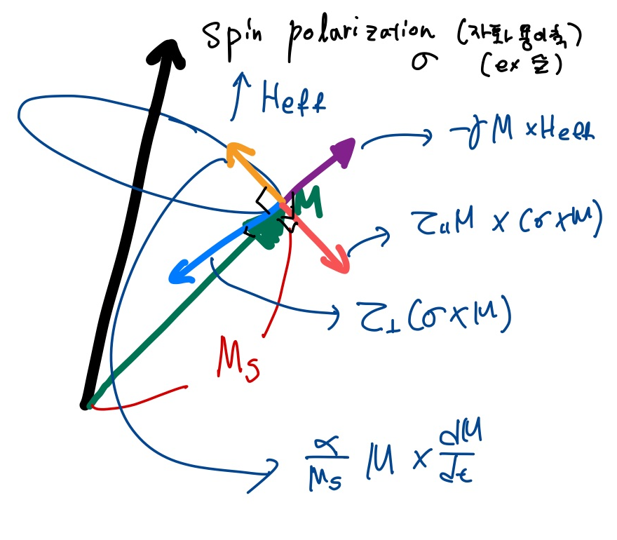 마지막으로 sigma는 spin polarization입니다. 각 상수가 이해가 안되신다면 본 포스팅에서 모두 이해하실 수 있습니다. 첫항은 field torque, 둘째항은 damping torque입니다.