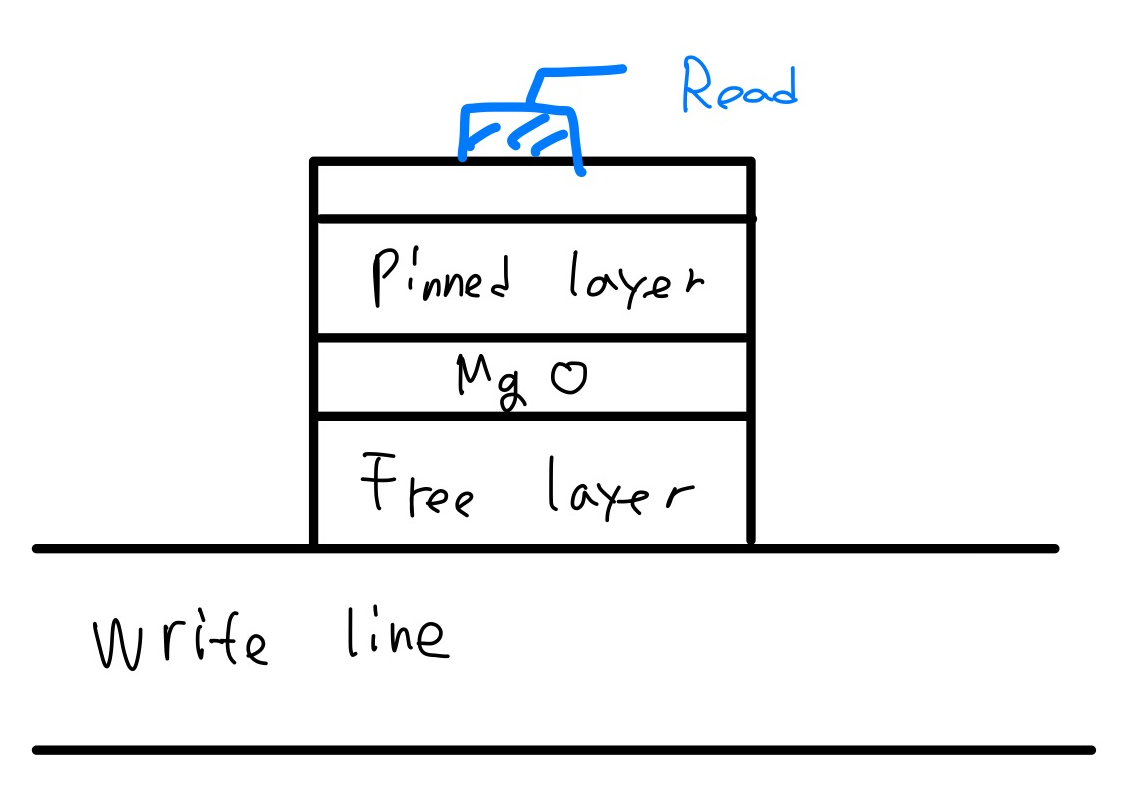 SOT-MRAM은 위 그림과 같이 Write Line과 Free layer, Tunnel barrier(MgO), Pinned layer로 구성됩니다.