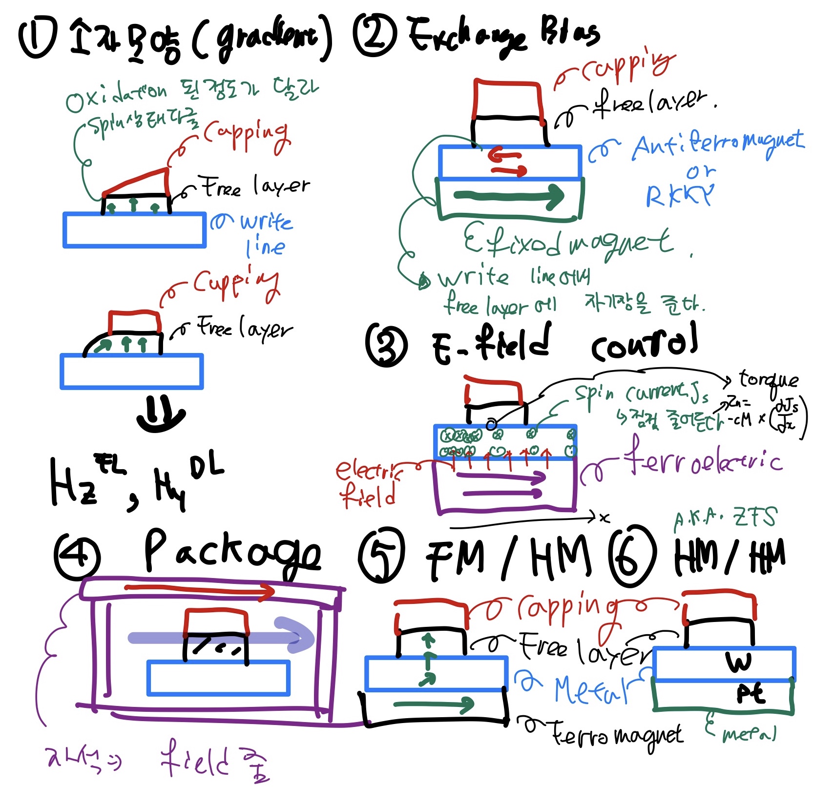 지금까지 크게 총 4가지 방법이 제시되었는데, 소자 모양을 변화시키는 방법과, write line에 Exchange bias을 작용할 수 있는 물질을 선택하는 방법과 외부 전기장을 가해주는 방법과 패키징 물질을 자석으로 하는 방법이 있습니다.