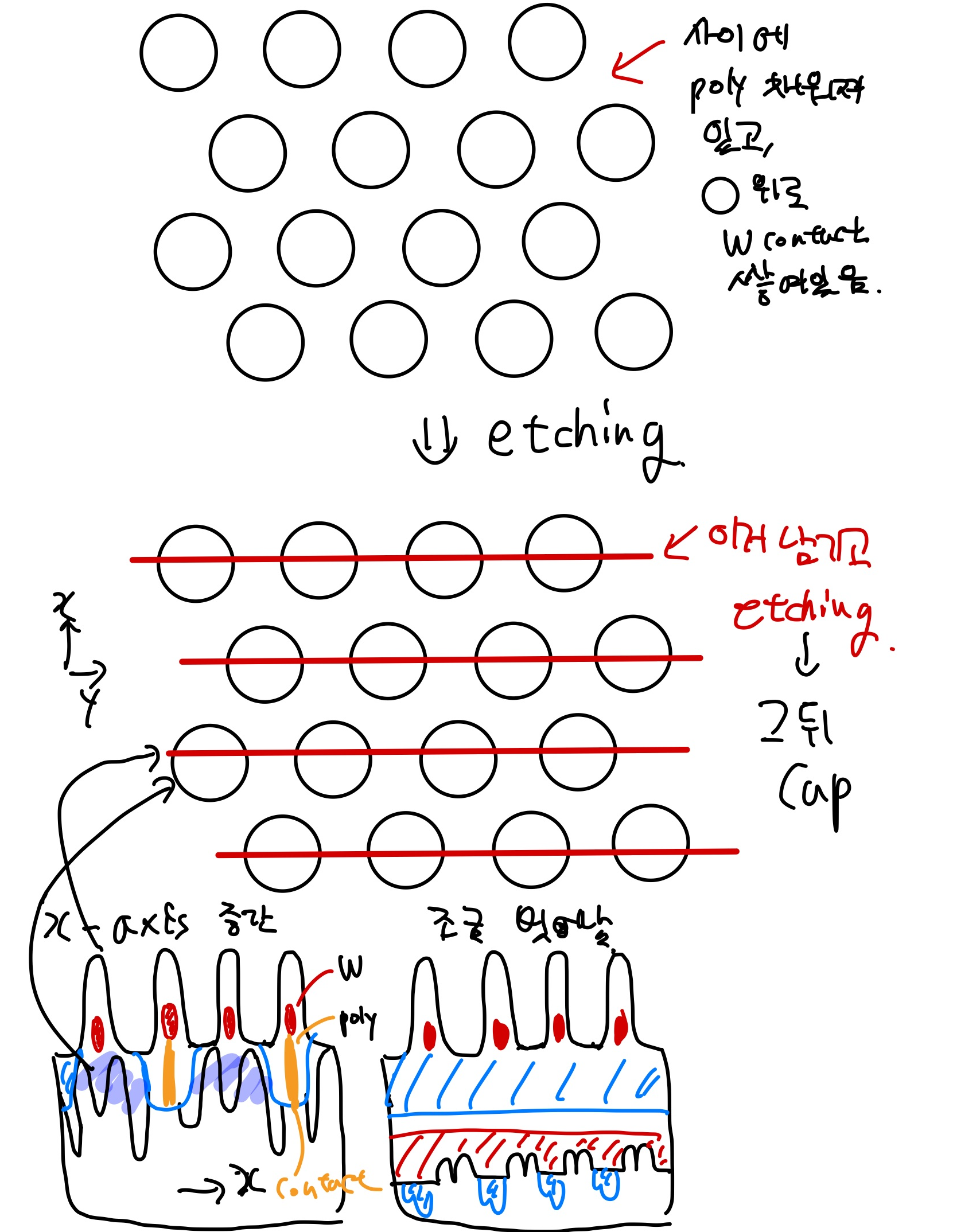 아까 배선도에서 x방향으로 잘라본다면(WL형성되는 방향) WL이 쭉 만들어져 있기 때문에, WL 피해서 BL을 만들어야 합니다. 다시 말해 WL과 WL 사이에 BLC를 만들 곳을 생각해 둡니다. 왼쪽 그림의 작은 뽈록이(빨간색으로 채워진 곳 아래)가 WL이 존재하는 ISO라고 했습니다.(다시 말해 ISO를 반 자른단면입니다.) 이 뽈록이의 중간과 BLC가 잘 만날 수 있게 물질을 ETCH해 둡니다. 이렇게 ETCH한 결과 왼쪽 그림처럼 됩니다. 다시말해 들어간 부분에 BLC가 형성되고, 튀어나온 건 절연 부분입니다.