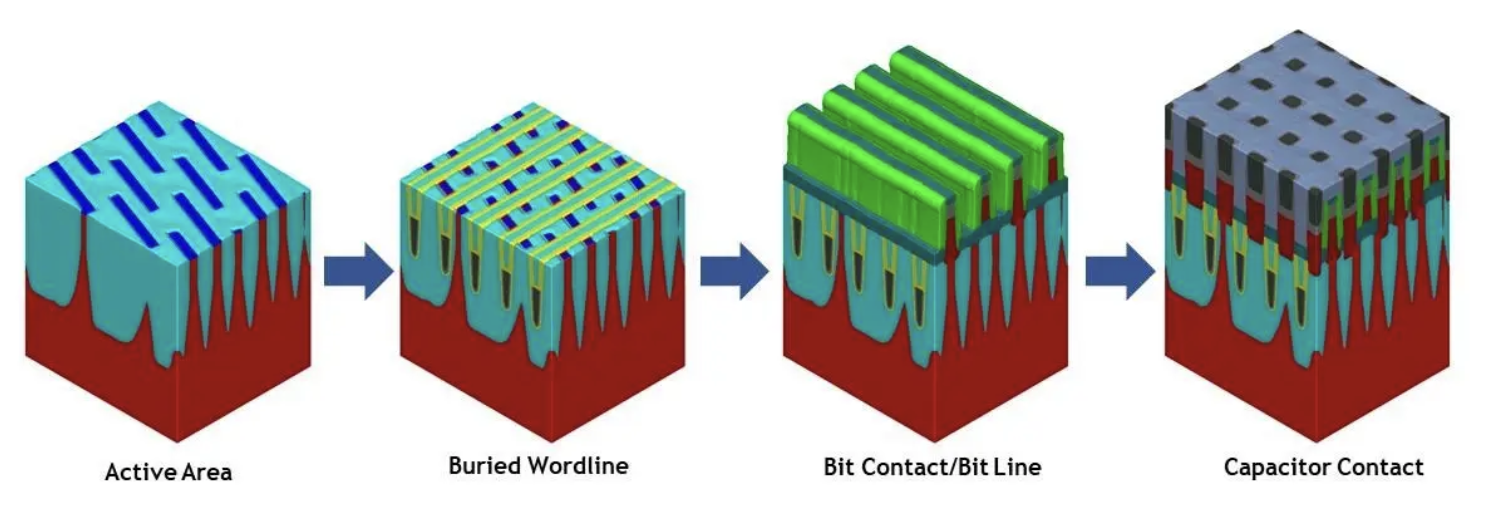 위 그림은 앞으로 설명할 공정 단계를 표기해둔 내용입니다. 본 포스팅 처음에 다루었던 모습과 사뭇 동떨어진 모습이지만, Active Area의 파란색이 본 포스팅 가장 첫 그림의 타원 구조이고 Buried Wordline에서 쑥 들어간 부분이 Transistor하나 입니다.(파란 타원에 쑥들어가는게 두개인게 본 포스팅 첫 그림과 같죠?) Bit Line은 Wordline과 수직하게 배치되고, Bit Line과 Wordlined을 다 쓰고 남은자리에 Capacitor가 배치되게 됩니다. 이제 이들을 하나하나 잘라서 살펴보겠습니다.