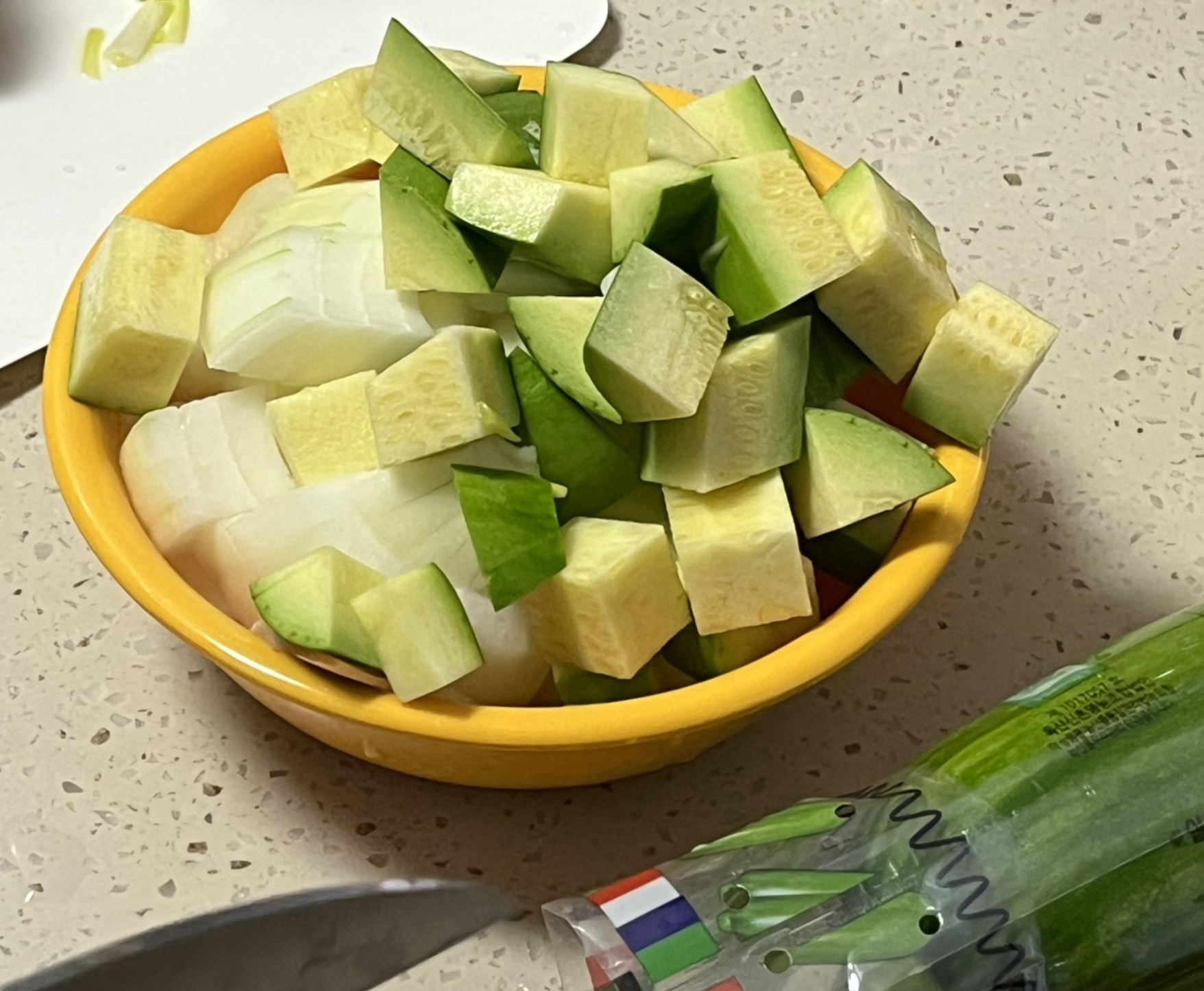애호박도 절반정도 사용했다. 고기와 양파 애호박 모두 깍둑썰기로 짜장면에 들어가는 모양으로 잘라주었다.